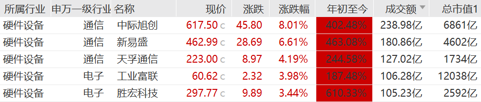 12月22日,市场情绪回暖,A股硬件设备方向再度爆发,中际旭创、新易盛、天孚通信、工业富联、胜宏科技等AI硬件巨头全天成交额占据全市场TOP5。年初至今,中际旭创、新易盛股价累计涨幅超400%,胜宏科技累计涨幅超600%。