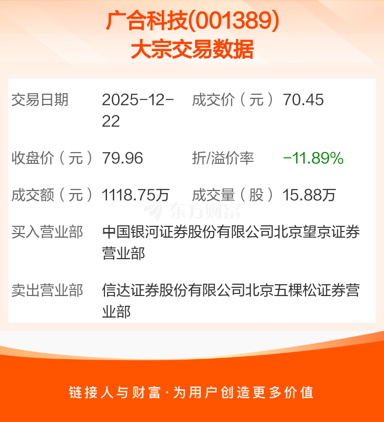 2025年12月22日,广合科技发生1笔大宗交易,共成交15.88万股,成交金额1118.75万元,占其流通市值比例为0.09%