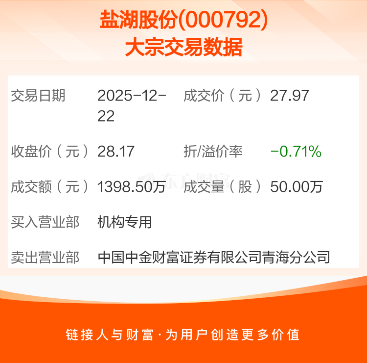 2025年12月22日,盐湖股份发生1笔大宗交易,共成交50.00万股,成交金额1398.50万元