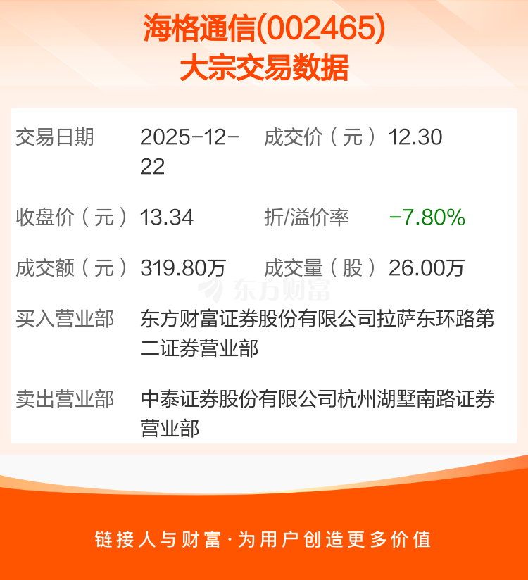 大宗交易:海格通信成交319.80万元,折价7.80%(12-22)