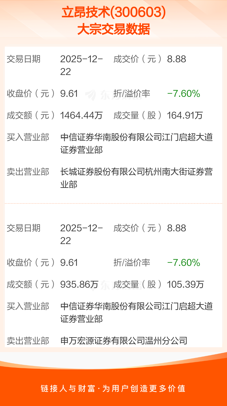 2025年12月22日,立昂技术发生2笔大宗交易,共成交270.30万股,成交金额2400.30万元,占其流通市值比例为0.68%。