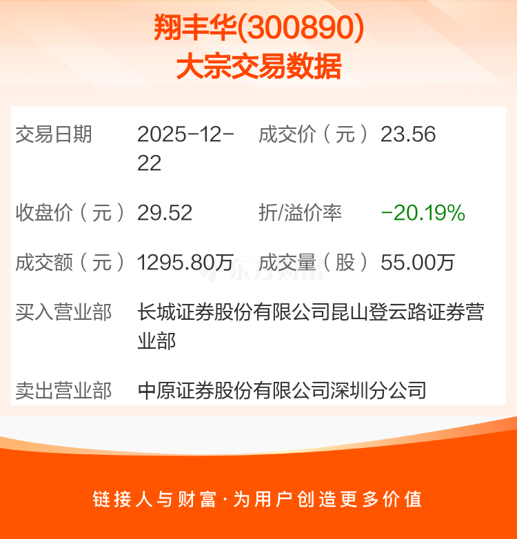 大宗交易:翔丰华成交1295.80万元,折价20.19%(12-22)