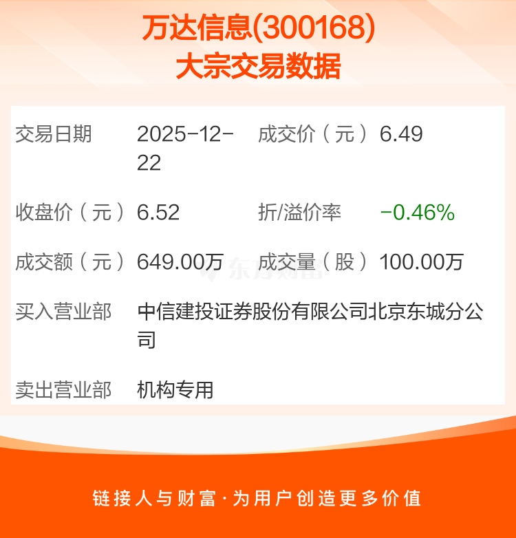 2025年12月22日,万达信息发生1笔大宗交易,共成交100.00万股,成交金额649.00万元,占其流通市值比例为0.07%。