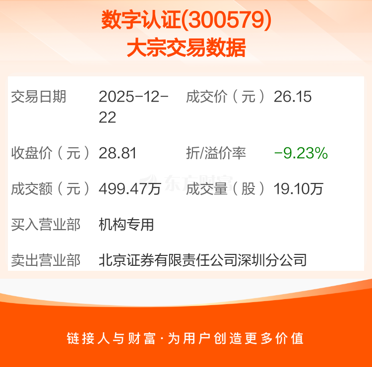 大宗交易:数字认证成交499.47万元,折价9.23%(12-22)