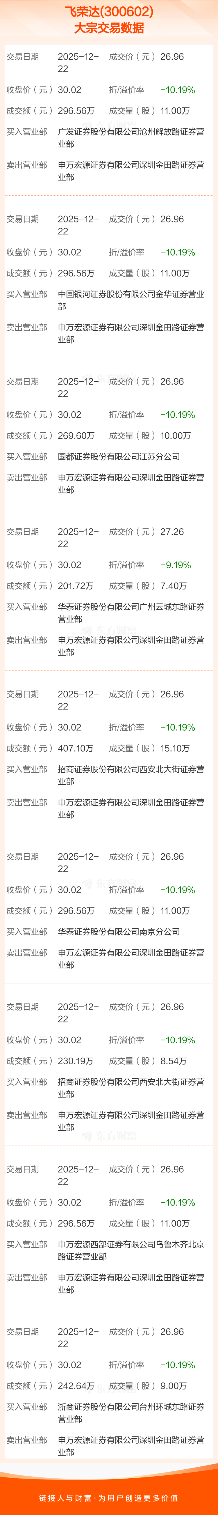 大宗交易:飞荣达成交2537.49万元,折价10.12%(12-22)