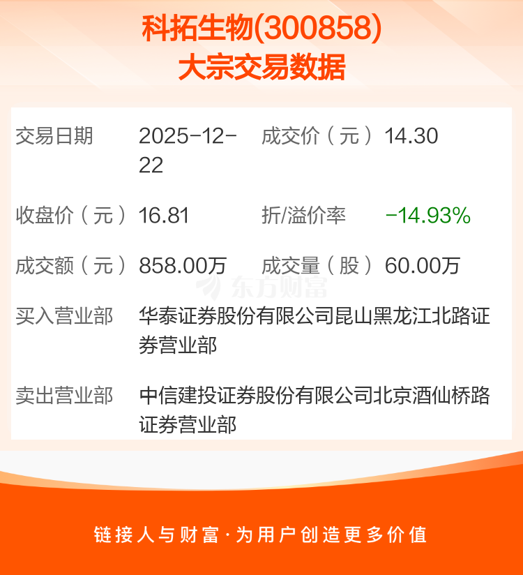 大宗交易:科拓生物成交858.00万元,折价14.93%(12-22)