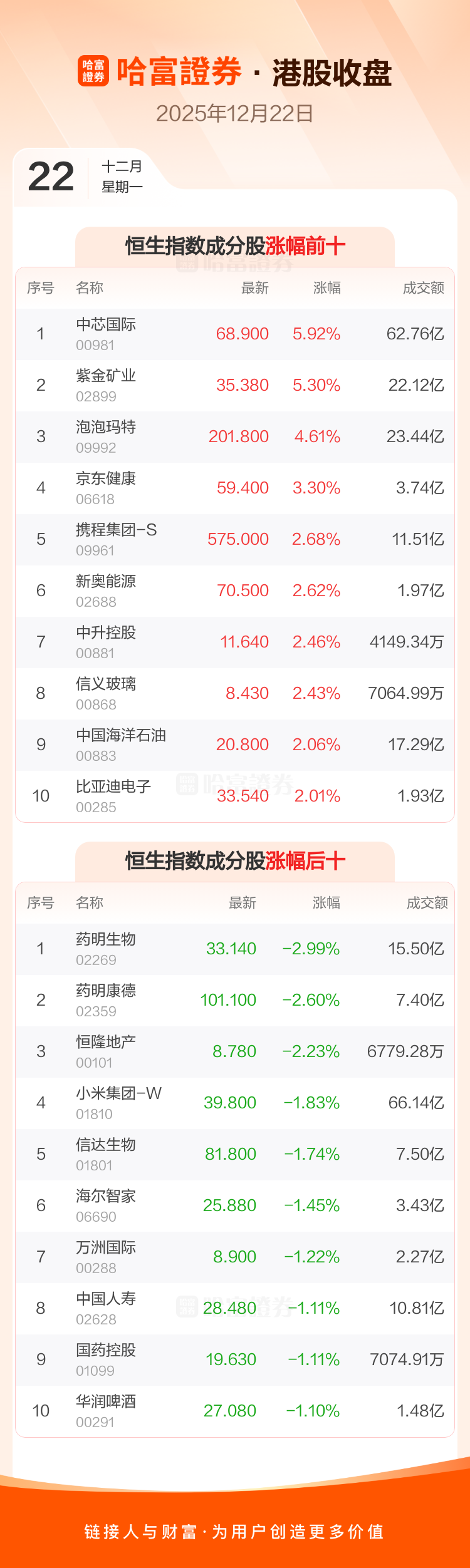 港股12月22日收盘走高,恒生指数收报25801.77点,涨111.24点,涨幅0.43%;恒生科技指数收报5526.83点,涨47.79点,涨幅0.87%。恒生指数成分股中中芯国际、紫金矿业、泡泡玛特涨幅居前,药明生物、药明康德、恒隆地产跌幅靠前。恒生科技指数成分股中商汤-W、中芯国际、华虹半导体涨幅居前,零跑汽车、金蝶国际、小米集团-W跌幅靠前。