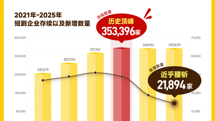 回溯短剧发展历程,2016年至2020年,行业迎来高速增长。借短视频热潮,短剧相关存续企业数从9.9万家增至24.3万家,年均增速超20%。近五年行业逐渐理性回调,新增企业先升后降,2022年以4.57万家创下新增峰值后逐年回落,2025年新增量2.19万家,较峰值缩水约50%。