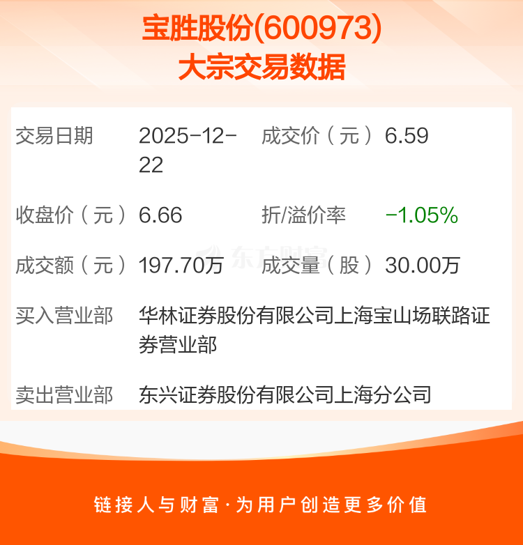 2025年12月22日,宝胜股份发生1笔大宗交易,共成交30.00万股,成交金额197.70万元,占其流通市值比例为0.02%。