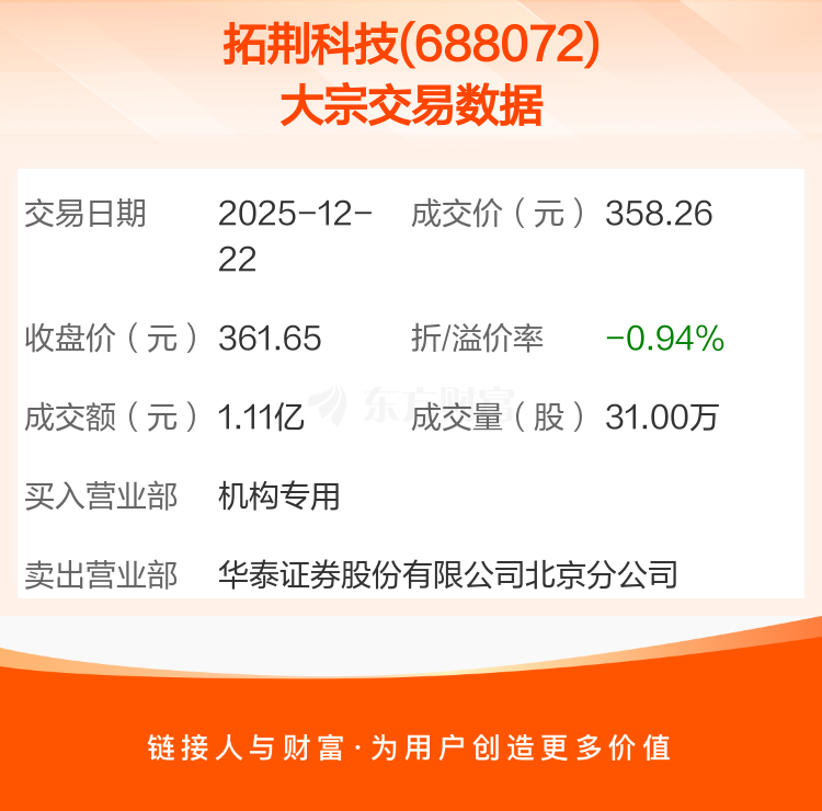 大宗交易:拓荆科技成交1.11亿元,折价0.94%(12-22)