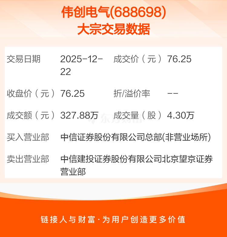 2025年12月22日,伟创电气发生1笔大宗交易,共成交4.30万股,成交金额327.88万元,占其流通市值比例为0.02%