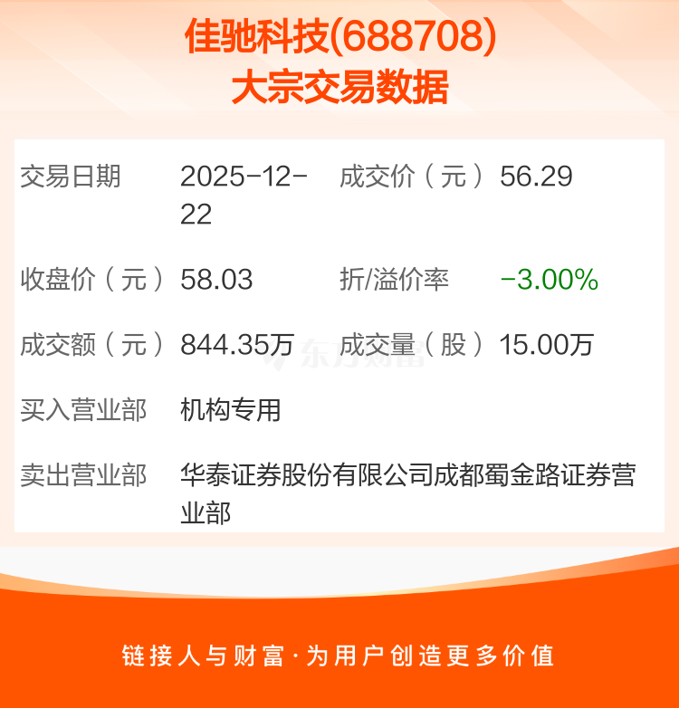 大宗交易:佳驰科技成交844.35万元,折价3.00%(12-22)