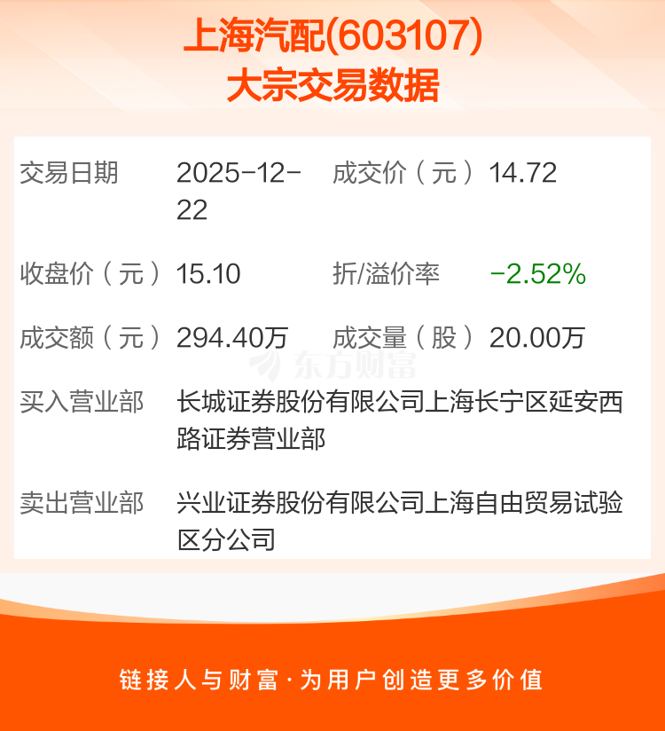 2025年12月22日,上海汽配发生1笔大宗交易,共成交20.00万股,成交金额294.40万元,占其流通市值比例为0.09%。