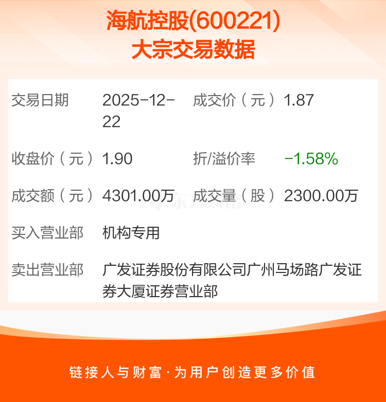 2025年12月22日,海航控股发生1笔大宗交易,共成交2300.00万股,成交金额4301.00万元,占其流通市值比例为0.07%。