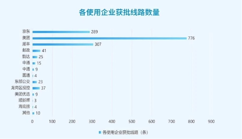 从区域分布看,无人车在福田区与宝安区的线路密度增长尤为显著,显示出区域应用场景的深化拓展。京东、美团、新石器等企业获批线路数量领先,应用主体日益多元化。