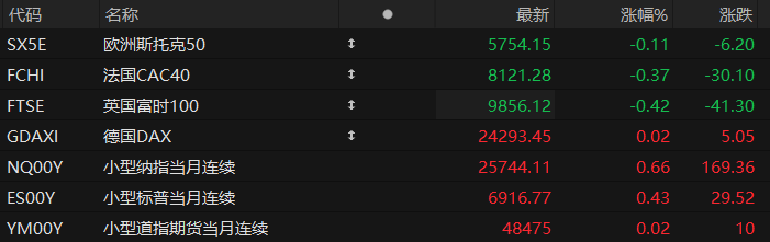 周一盘前,美股三大股指期货齐涨,欧洲主要指数多数下跌。截至发稿,纳斯达克100指数期货涨0.66%,标普500指数期货涨0.43%,道指期货涨0.02%。