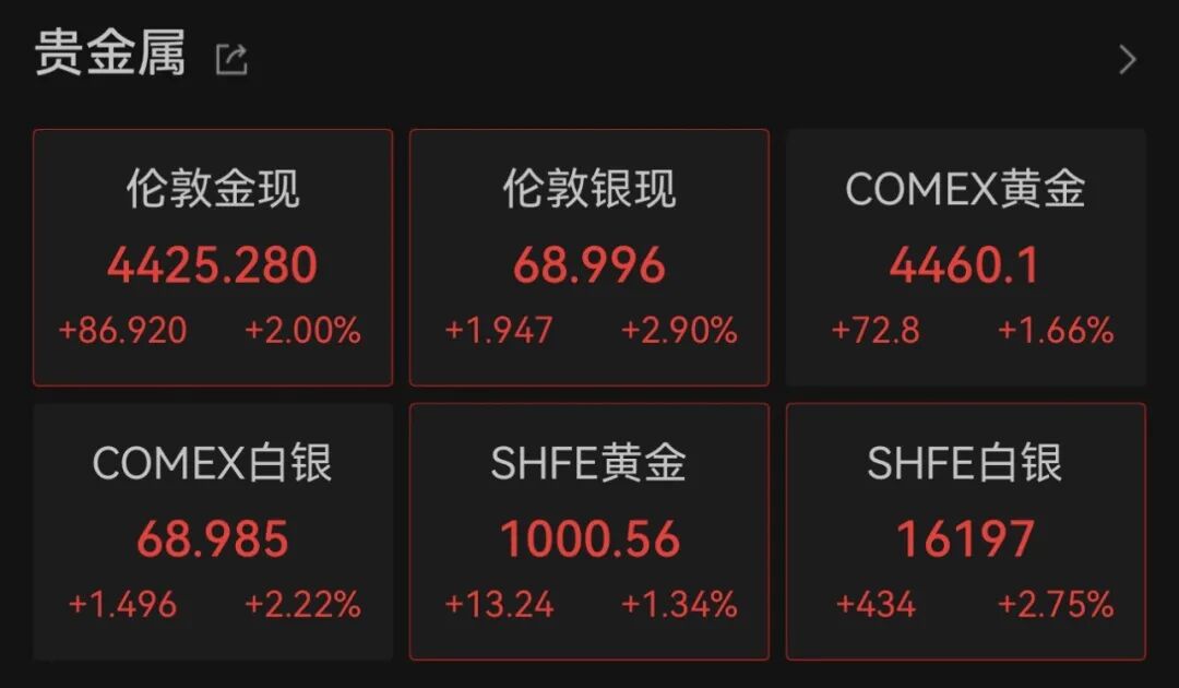 Wind数据显示,截至北京时间12月22日22:02,伦敦银现货价格报68.996美元/盎司,上涨2.98%;伦敦金现货价格报4425.280美元/盎司,上涨2%;COMEX白银期货价格报68.985美元/盎司,上涨2.22%;COMEX黄金期货价格报4460.1美元/盎司,上涨1.66%。