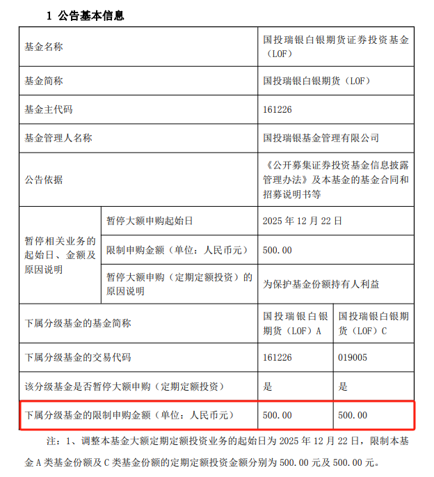 近期C类份额申赎频繁,大量资金的短期涌入对基金的日常运作带来了较大挑战。该基金主要投资于白银期货合约,大量资金的频繁进出会显著扩大基金的“跟踪误差”。资金规模的剧烈波动会迫使投资组合频繁调整仓位,不仅增加了交易成本,更直接影响基金对标的指数的跟踪效果,进而影响基金份额持有人的利益。申购限额旨在减缓规模短期波动,亦是为了提高投资运作的有序性,维护投资者的利益。