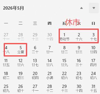 (四)劳动节:5月1日(星期五)至5月5日(星期二)休市,5月9日(星期六)为周末休市。5月6日(星期三)起照常开市。