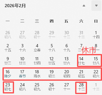 (二)春节:2月15日(星期日)至2月23日(星期一)休市,2月24日(星期二)起照常开市。另外,2月14日(星期六)、2月28日(星期六)为周末休市。
