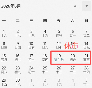 (五)端午节:6月19日(星期五)至6月21日(星期日)休市,6月22日(星期一)起照常开市。