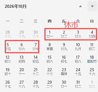 (七)国庆节:10月1日(星期四)至10月7日(星期三)休市,10月8日(星期四)起照常开市。另外,9月20日(星期日)、10月10日(星期六)为周末休市。