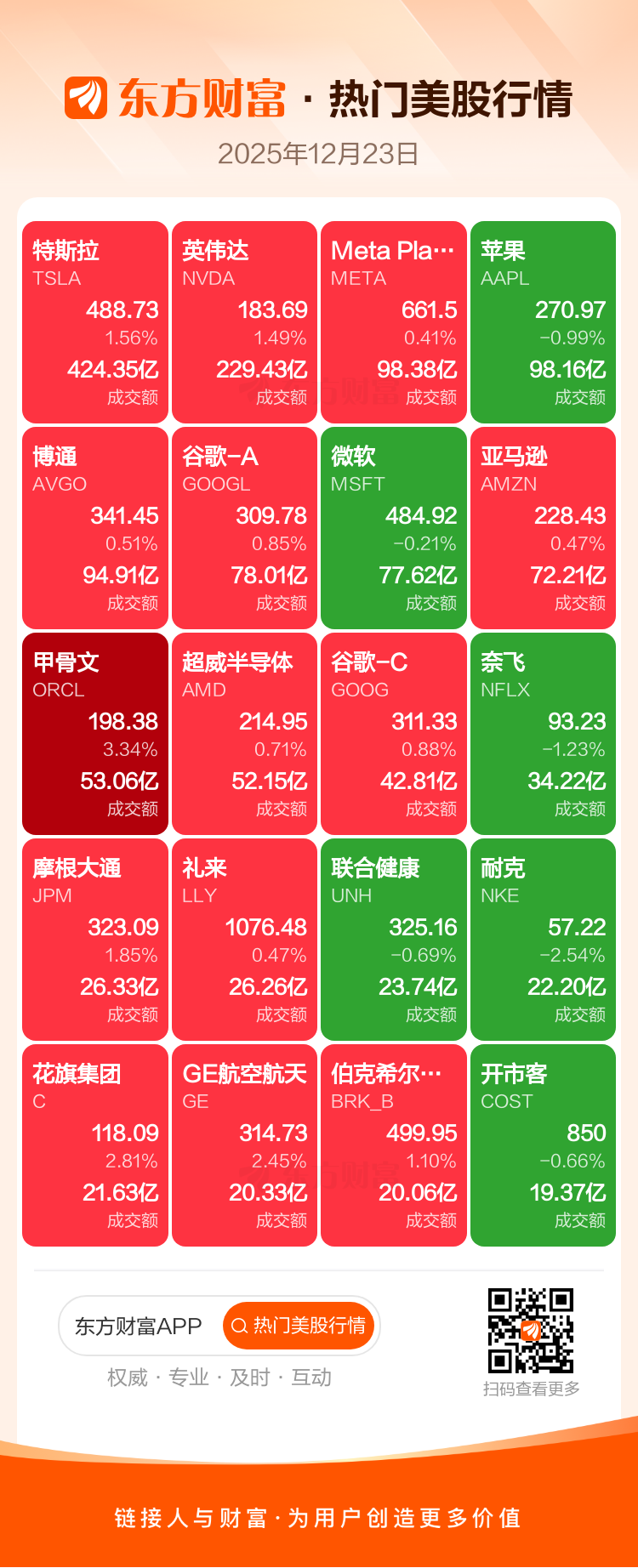 特斯拉涨1.56%,英伟达涨1.49%,Meta Platforms Inc-A涨0.41%,苹果跌0.99%,博通涨0.51%,谷歌-A涨0.85%,微软跌0.21%,亚马逊涨0.47%,甲骨文涨3.34%,超威半导体涨0.71%。