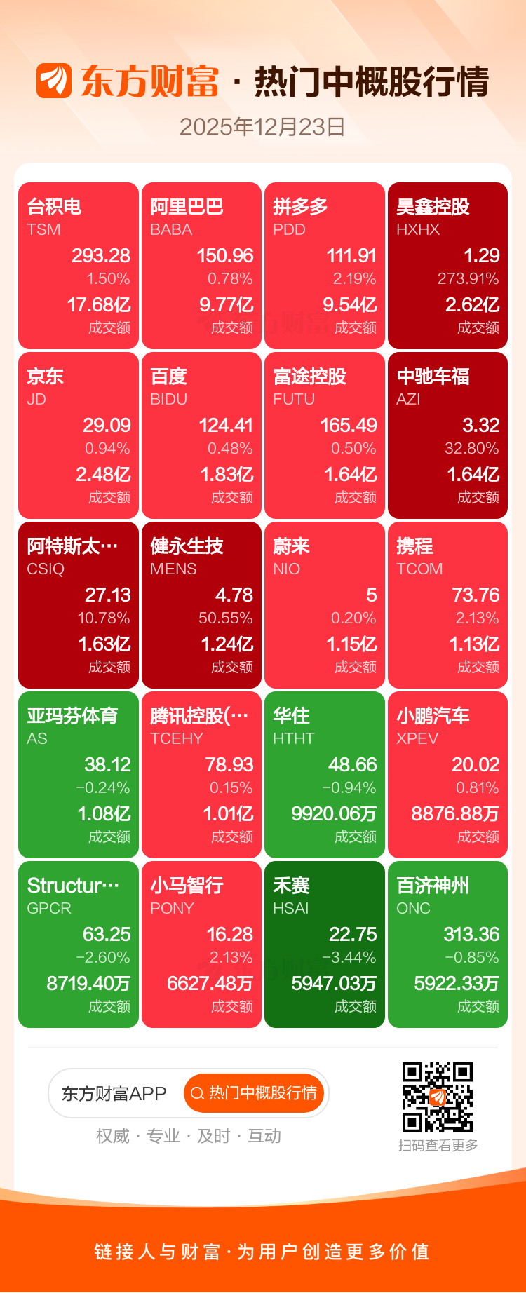 台积电涨1.50%,阿里巴巴涨0.78%,拼多多涨2.19%,昊鑫控股涨273.91%,京东涨0.94%,百度涨0.48%,富途控股涨0.50%,中驰车福涨32.80%,阿特斯太阳能涨10.78%,健永生技涨50.55%。