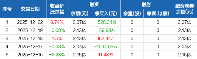 融资方面,当日融资买入948.2万元,融资偿还1476.55万元,融资净偿还528.34万元。融券方面,融券卖出0股,融券偿还0股,融券余量0股,融券余额0元。融资融券余额合计2.07亿元。