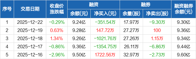 光威复材融资融券信息显示,2025年12月22日融资净偿还351.54万元;融资余额9.24亿元,较前一日下降0.38%