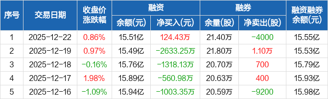 融资方面,当日融资买入4624.89万元,融资偿还4500.46万元,融资净买入124.43万元。融券方面,融券卖出300股,融券偿还4300股,融券余量21.4万股,融券余额403.18万元。融资融券余额合计15.55亿元。