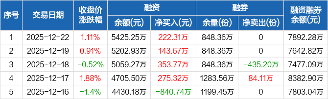 融资方面,当日融资买入1663.38万元,融资偿还1441.07万元,融资净买入222.31万元,连续4日净买入累计995.06万元。融券方面,融券卖出0份,融券偿还0份,融券余量848.36万份,融券余额2467.03万元。融资融券余额合计7892.28万元。
