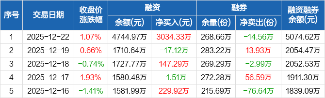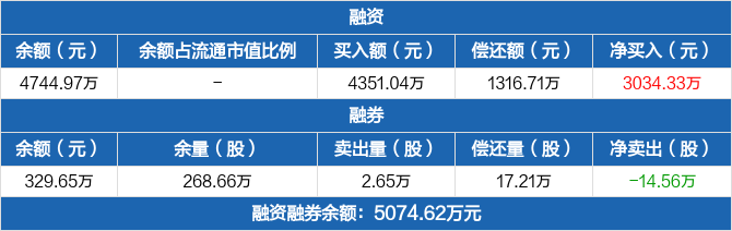 融资方面,当日融资买入4351.04万元,融资偿还1316.71万元,融资净买入3034.33万元。融券方面,融券卖出2.65万份,融券偿还17.21万份,融券余量268.66万份,融券余额329.65万元。融资融券余额合计5074.62万元。
