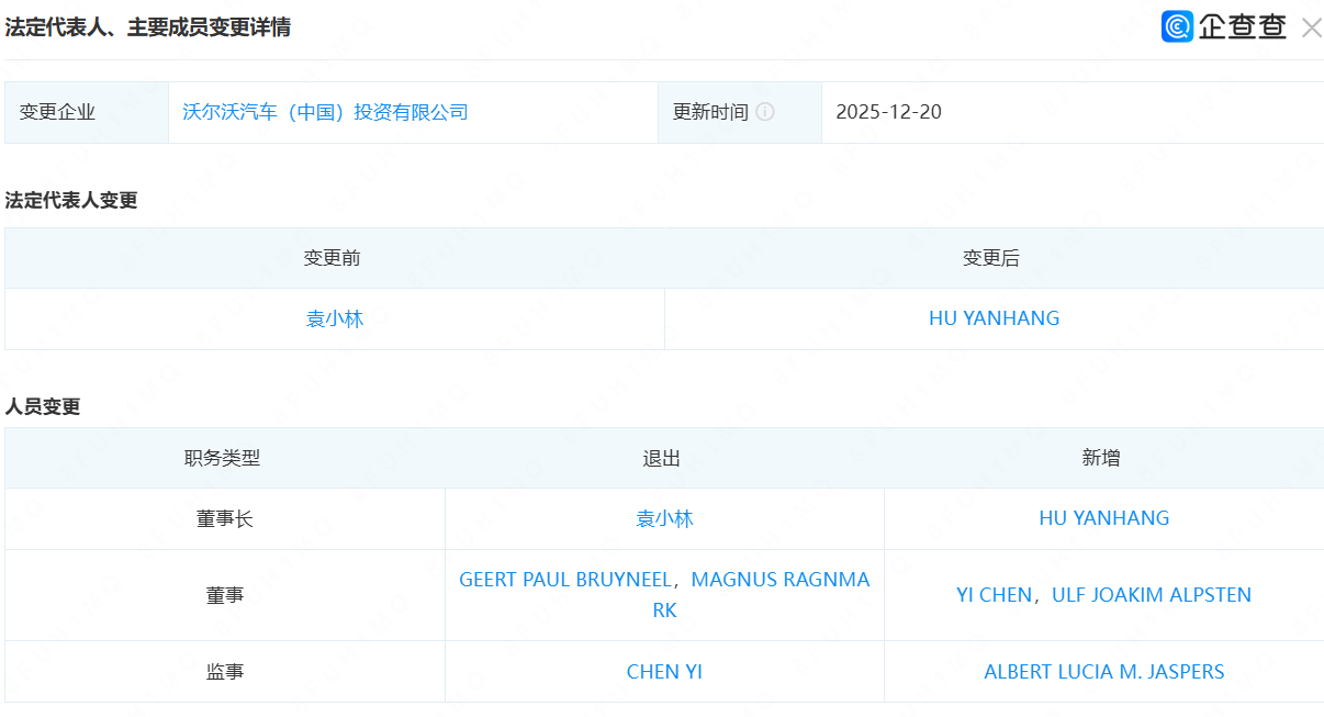 日前,企查查App显示,沃尔沃汽车(中国)投资有限公司(以下简称“沃尔沃中国”)发生重大工商变更,原董事长袁小林卸任法定代表人及董事长职务,由HU YANHANG接任,同时多位高管同步调整。