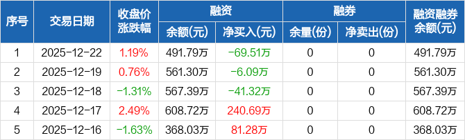 融资方面,当日融资买入139.95万元,融资偿还209.46万元,融资净偿还69.51万元,连续3日净偿还累计116.92万元。融券方面,融券卖出0份,融券偿还0份,融券余量0份,融券余额0元。融资融券余额合计491.79万元。