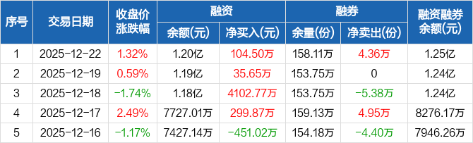 融资方面,当日融资买入863.6万元,融资偿还759.09万元,融资净买入104.5万元,连续4日净买入累计4542.8万元。融券方面,融券卖出4.61万份,融券偿还2500份,融券余量158.11万份,融券余额546.43万元。融资融券余额合计1.25亿元。