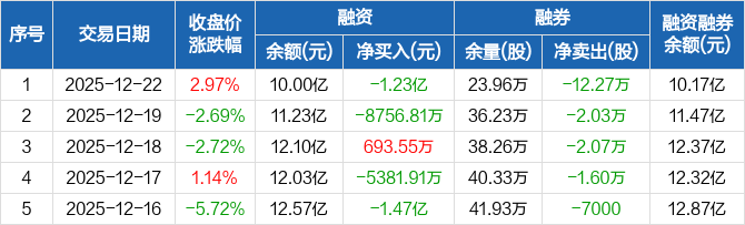 杰瑞股份融资融券信息显示,2025年12月22日融资净偿还1.23亿元;融资余额10亿元,较前一日下降10.93%。