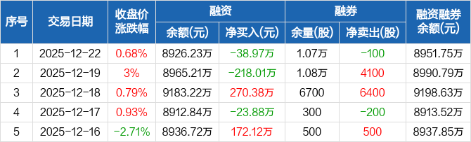 融资方面,当日融资买入493.26万元,融资偿还532.24万元,融资净偿还38.97万元。融券方面,融券卖出0股,融券偿还100股,融券余量1.07万股,融券余额25.52万元。融资融券余额合计8951.75万元。