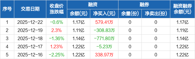融资方面,当日融资买入5046.98万元,融资偿还4467.57万元,融资净买入579.41万元。融券方面,融券卖出0份,融券偿还0份,融券余量0份,融券余额0元。融资融券余额合计1.17亿元。