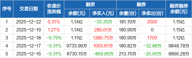 融资方面,当日融资买入600.82万元,融资偿还634.17万元,融资净偿还33.35万元。融券方面,融券卖出2000份,融券偿还0份,融券余量181.19万份,融券余额115.96万元。融资融券余额合计1.15亿元。