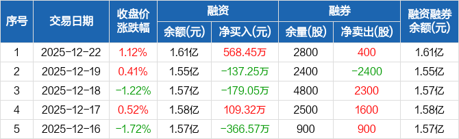 融资方面,当日融资买入1041.86万元,融资偿还473.41万元,融资净买入568.45万元。融券方面,融券卖出400股,融券偿还0股,融券余量2800股,融券余额7.59万元。融资融券余额合计1.61亿元。