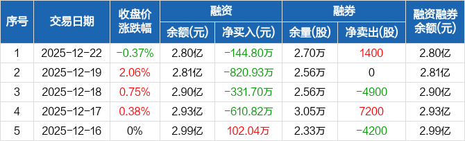 双塔食品融资融券信息显示,2025年12月22日融资净偿还144.8万元;融资余额2.8亿元,较前一日下降0.51%。