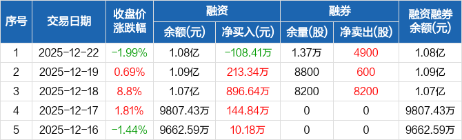 融资方面,当日融资买入1337.27万元,融资偿还1445.68万元,融资净偿还108.41万元。融券方面,融券卖出5400股,融券偿还500股,融券余量1.37万股,融券余额21.56万元。融资融券余额合计1.08亿元。