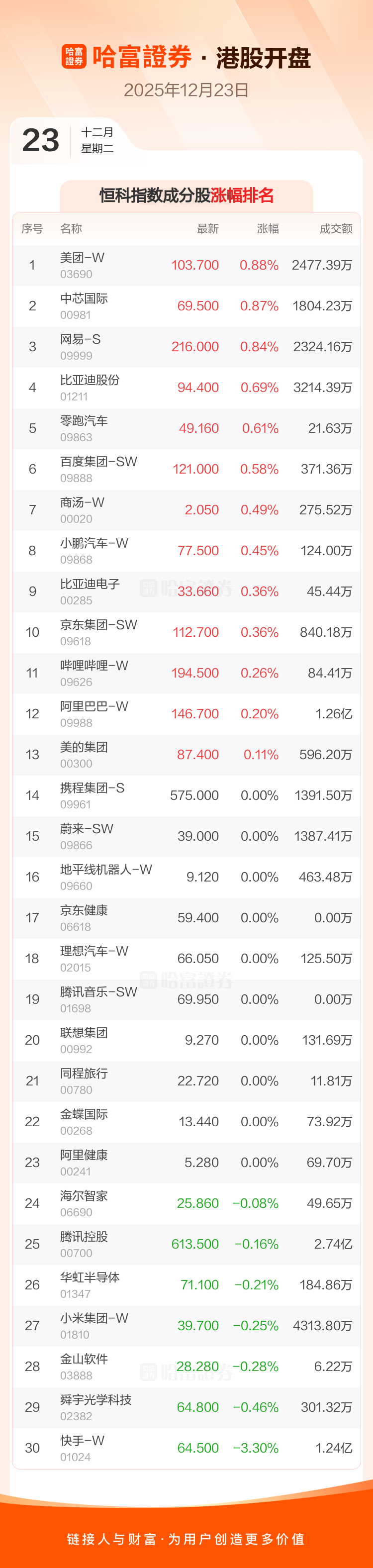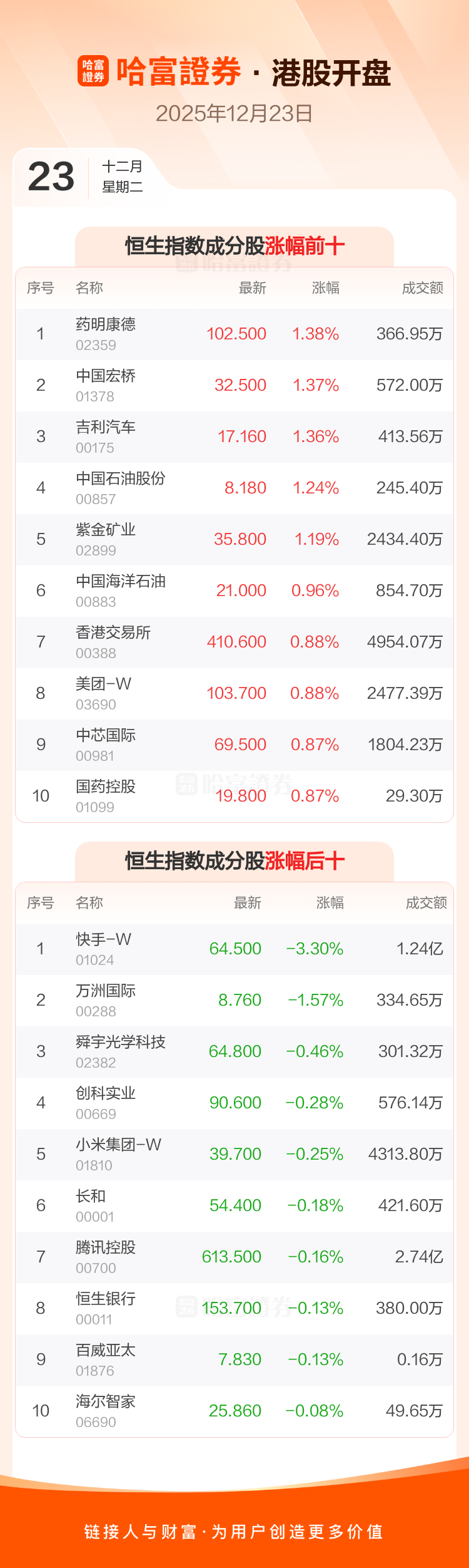 港股12月23日高开,恒生指数开盘报25875.85点,涨74.08点,涨幅0.29%;恒生科技指数开盘报5534.54点,涨7.71点,涨幅0.14%。恒生指数成分股中药明康德、中国宏桥、吉利汽车涨幅居前,快手-W、万洲国际、舜宇光学科技跌幅靠前。恒生科技指数成分股中美团-W、中芯国际、网易-S涨幅居前,快手-W、舜宇光学科技、金山软件跌幅靠前。