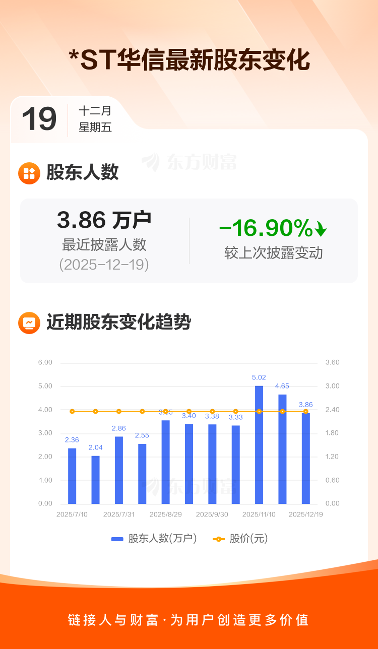 *ST华信:截至12月19日最新股东户数3.86万户,较上期减少16.90%