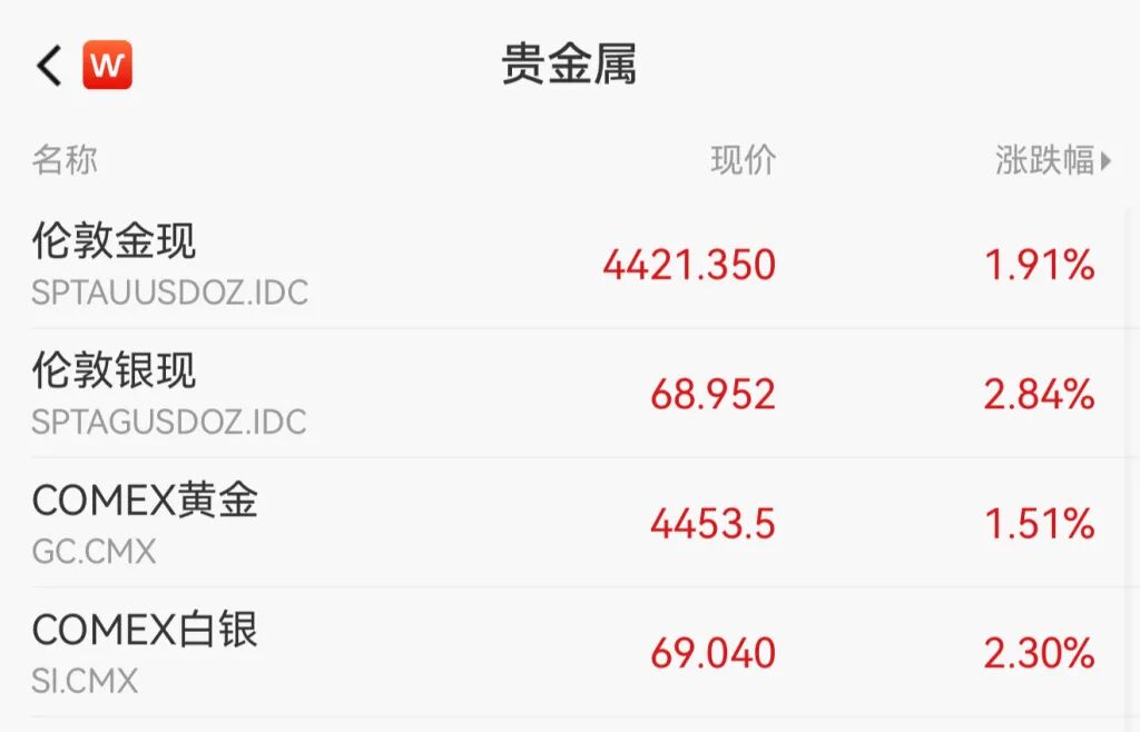 现货、期货白银同频共振,再创新高。截至发稿,伦敦银现报68.952美元/盎司,日内涨幅达2.84%;COMEX白银报69.04美元/盎司,日内涨幅达2.3%。