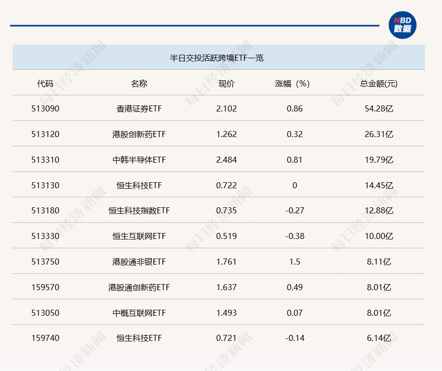 周二上午,行业、主题类ETF交投较周一略显平淡,科创芯片ETF(588200)和证券ETF(512880)半日成交金额超过10亿元。跨境ETF方面,香港证券ETF(513090)半日成交金额达到54.28亿元,其余相关ETF半日成交金额则均未超过30亿元。