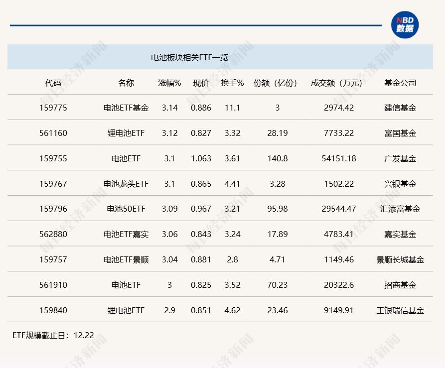ETF涨幅榜方面,多只锂电股盘中大幅上涨,带动电池ETF今日集体反弹,其中,包括电池ETF基金(159775)在内的7只电池ETF半日涨幅超过3%。