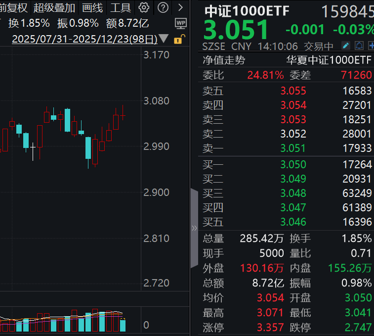 12月23日,A股三大指数集体上涨,其中沪指上涨0.10%。截至14:09,中证1000ETF(159845)下跌0.03%。其他宽基指数中,上证50涨0.29%,沪深300涨0.27%,中证500涨0.06%。