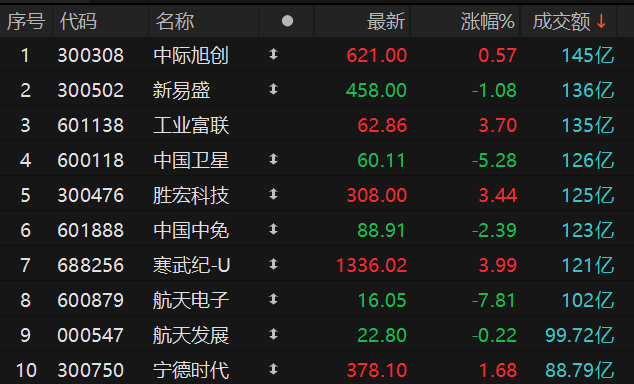 个股方面,中际旭创成交额居首,为145亿元。其次是新易盛、工业富联、中国卫星、胜宏科技,成交额分别为136亿元、135亿元、126亿元、125亿元。